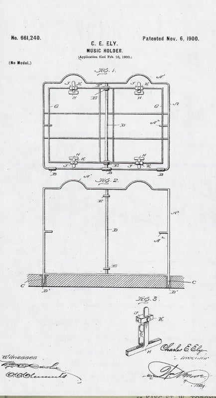 The second patent, #661,240 was less controversial. Approval was given to the document dated November 6, 1900, for the “certain new and useful improvements in Music-Holders.”