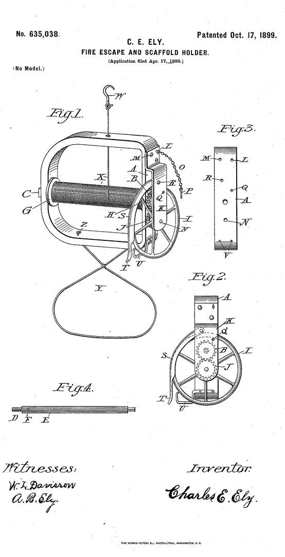 Patent #635,038, dated October 17, 1899, was awarded for a “Fire-Escape and Scaffold-Holder, but which, when made larger and stronger, can be successfully used in bridge-building for raising and lowering heavy timbers and irons, and the fire-escape can be used with safety in descending from a balloon.”