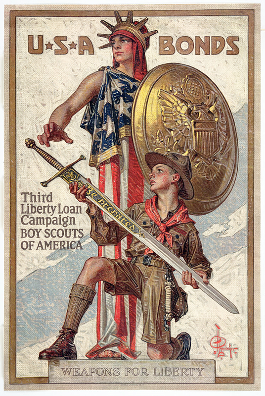 The members of Troop 1, all in their teens, had been strongly influenced by the sentiments of their parents and other adults when it came to supporting the country's war efforts. They eagerly participated in so-called patriotic activities. They joined other scouts across the U.S. in five Liberty Bond drives that totaled almost $353 million in bond subscriptions and over $43 million in war stamps. Some grew food in Boy Scout gardens, distributed over 300 million pieces of literature for the government, and collected peach pits for use in gas mask filters.